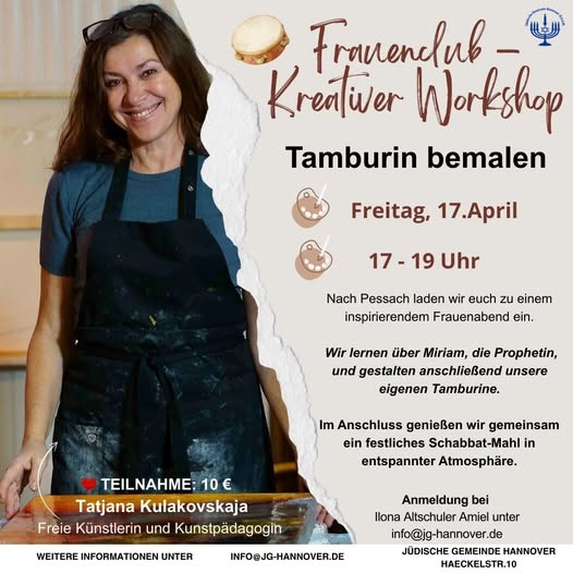 Gemeinsam werden wir über die Prophetin Miriam lernen und entdecken, woher die wahre „Women Power“ stammt. Mit einer professionellen Künstlerin gestalten wir anschließend unser eigenes Tamburin und lernen dabei verschiedene Acryltechniken. Vorkenntnisse sind nicht erforderlich.