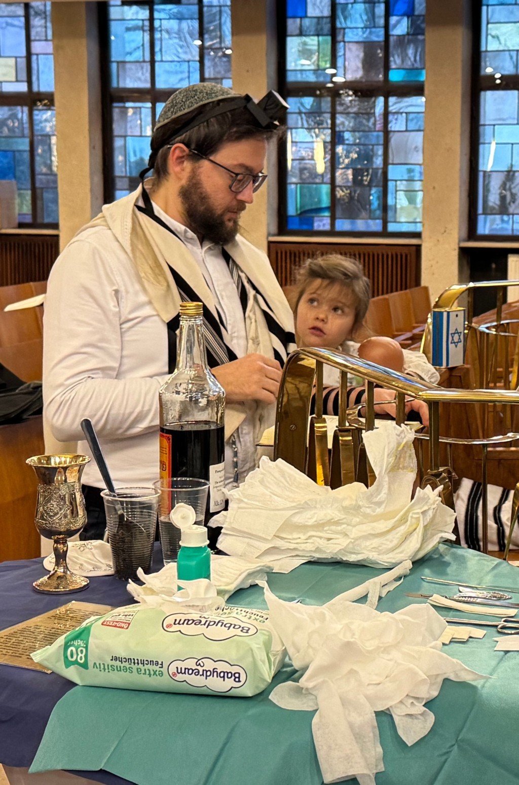Ein großer und bewegender Dank gilt unserem Mohel, Dr. Jehoschua Bieler (Jehoschua Bieler), für seine Fürsorge, Hingabe, Professionalität, seine Tora und Gottesfurcht. Es war eine große Freude, vor der Brit gemeinsam im Minjan zu beten.