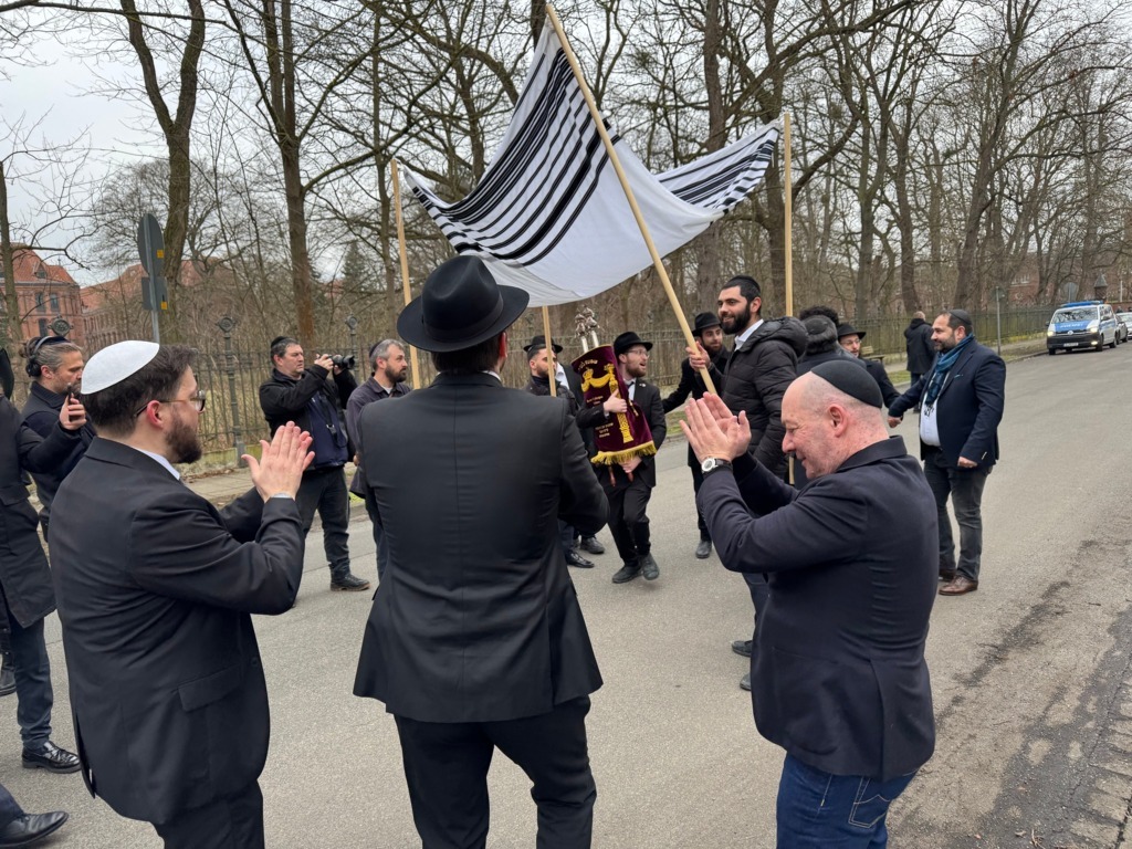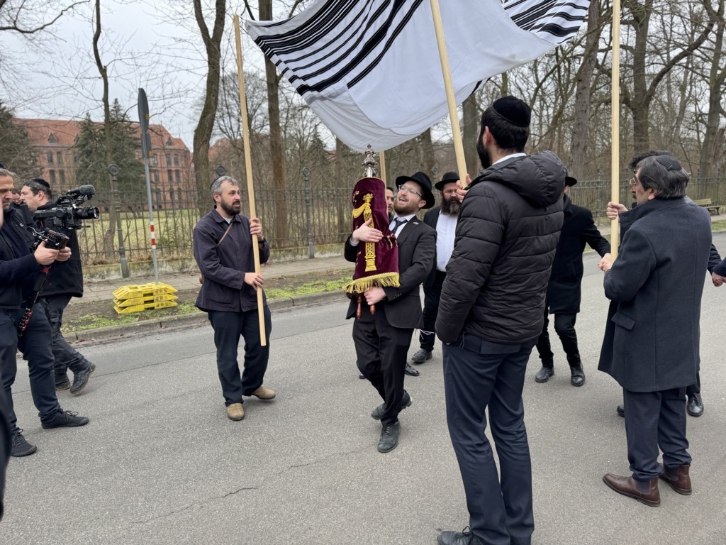 Die Feierlichkeiten begannen mit der Einweihung einer neuen Thorarolle aus Jerusalem. Die Mitglieder der Gemeinde füllten gemeinsam die letzten Buchstaben des Schriftbands aus und zogen singend und tanzend durch die Haeckelstraße, um die jüdische Freude offen und stolz ins Stadtzentrum zu tragen.